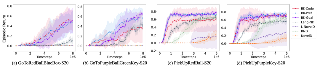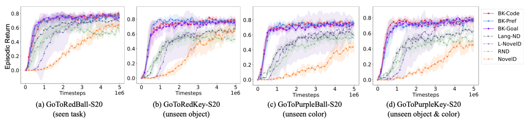 在Minigrid的四个任务中(包括有的新目标物体类型和颜色是知识提取时未出现过的),三种变体均全面超越了现有的探索增强基线方法和基于语言的探索方法(如RND、NovelD等)。即使对于LLM从未“见过”的新任务类型,利用背景知识的智能体依然展现出明显优势,证明提取的知识确实具有任务无关性,可以泛化到新的目标。更难能可贵的是,提炼背景知识只需一次LLM调用,后续训练零 LLM调用成本。