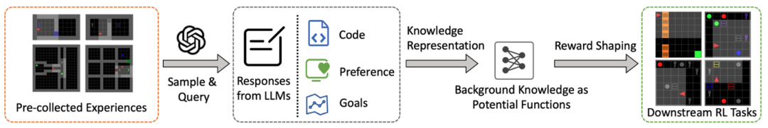 在经典RL流程里,智能体只有在撞了南墙、遍历海量状态后,才能慢慢学到怎么完成任务,样本效率极低。过去也有人引入大模型提示,但通常每换一个任务就得重新写prompt、再调一次API,既贵又难迁移。