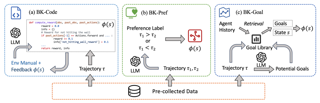 研究者用RND算法在环境里进行随机探索和学习,把看到的状态、动作都存下来当“原料”。这些轨迹不带任何任务标签,保证提炼出的知识足够通用。接下来把轨迹描述交给GPT,让它帮忙点评:“哪些行为更像是合理、聪明的?” 具体有三种提炼套路,分别对应三条技术路线(论文称BK-CODE、BK-PREF、BK-GOAL)。