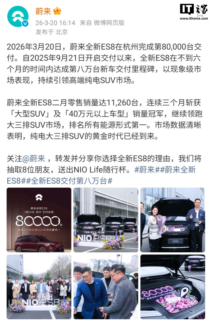 IT之家3月20日消息,蔚来今日宣布,全新ES8在杭州完成第80000台交付。自2025年9月21日开启交付以来,全新ES8在不到六个月的时间内达成第八万台新车交付里程碑。